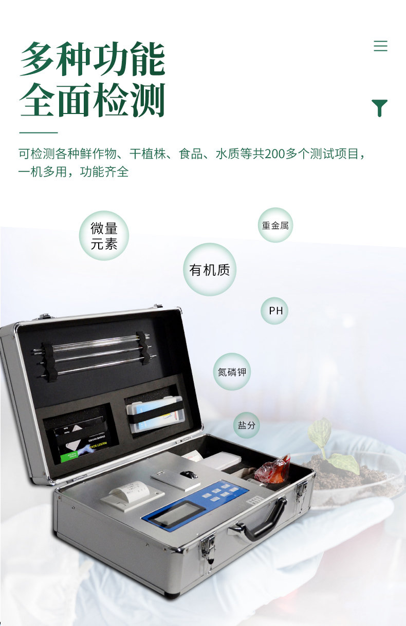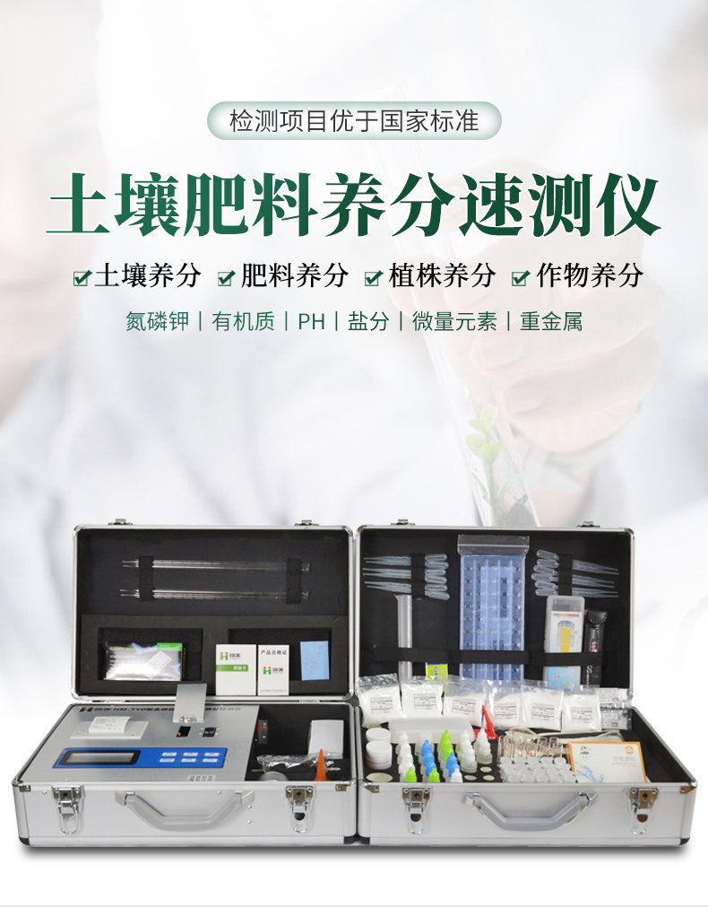 配套齊全:該儀器集藥、器、儀為一體,攜帶方便,相當(dāng)于一個(gè)小型實(shí)驗(yàn)室。適于農(nóng)業(yè)服務(wù)部門或農(nóng)資經(jīng)銷商、肥料廠商測(cè)土施肥和鑒別肥料真假。