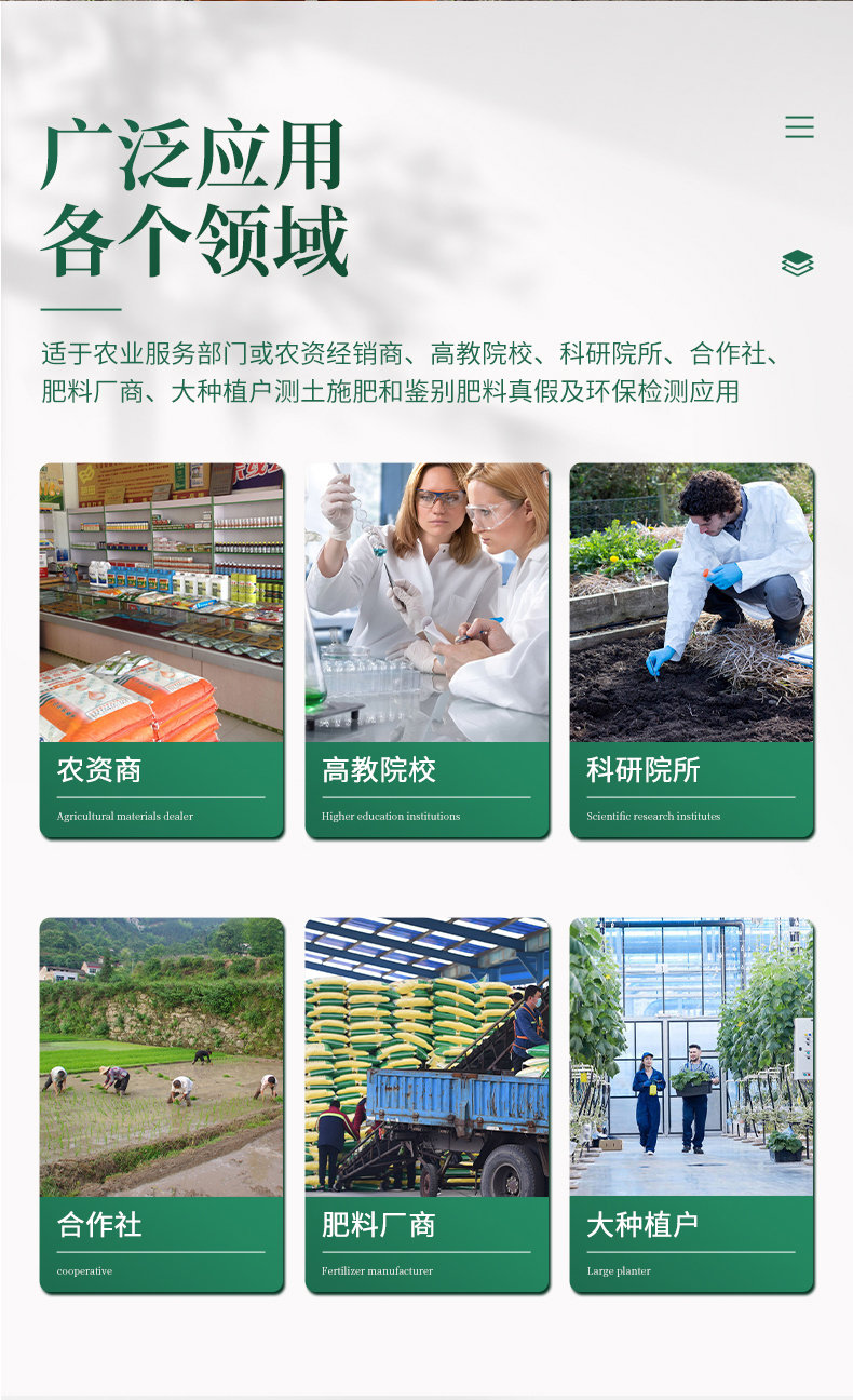 ★測(cè)土配方儀可檢測(cè)化肥、有機(jī)肥(含葉面肥、水溶肥、噴施肥)生物肥等中的速效氮、速效磷、有效鉀、全氮、全磷、全鉀、有機(jī)質(zhì)、酸堿度,鈣、鎂、硫、鐵、錳、硼、鋅、銅、氯、硅、鉬等各種中微量元素以及鉛、鉻、鎘、汞、砷、鎳、鋁、氟、鈦、硒等各種重金屬含量。