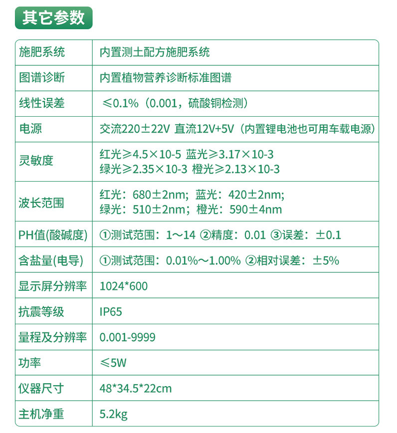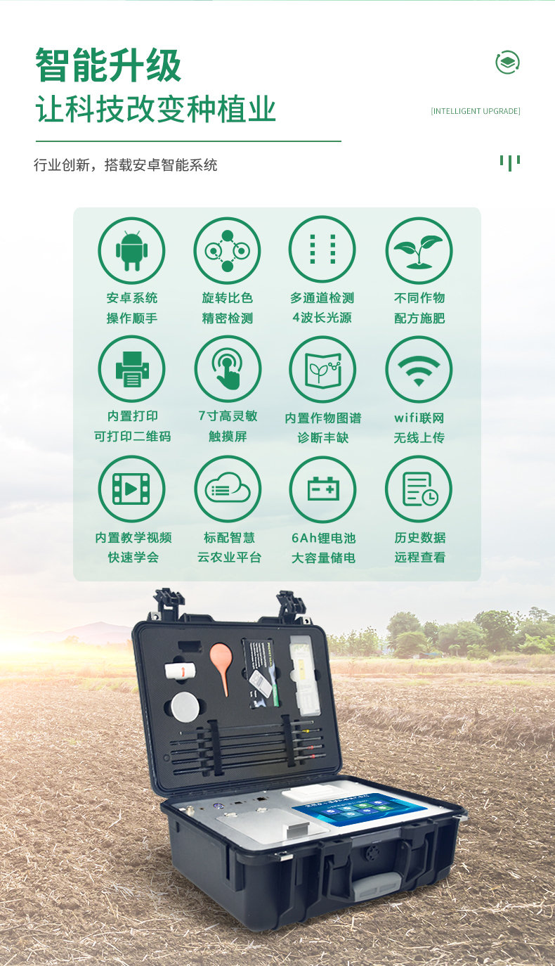 配套齊全:該儀器集藥、器、儀為一體,無需用戶自配附件,相當(dāng)于一個小型移動實驗室,攜帶方便,亦可野外流動測試。適于農(nóng)業(yè)服務(wù)部門或農(nóng)資經(jīng)銷商、合作社、肥料廠商、大種植戶測土施肥。