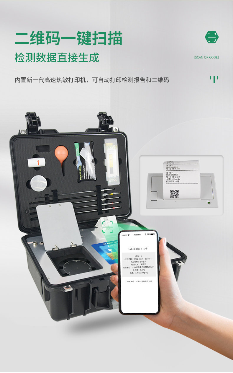 15、內(nèi)置新一代高速熱敏打印機(無需色帶),打印內(nèi)容包含:檢測單位、檢測人員、檢測項目、通道號、吸光度、養(yǎng)分含量(mg/kg)、檢測時間、以及二維碼等信息
