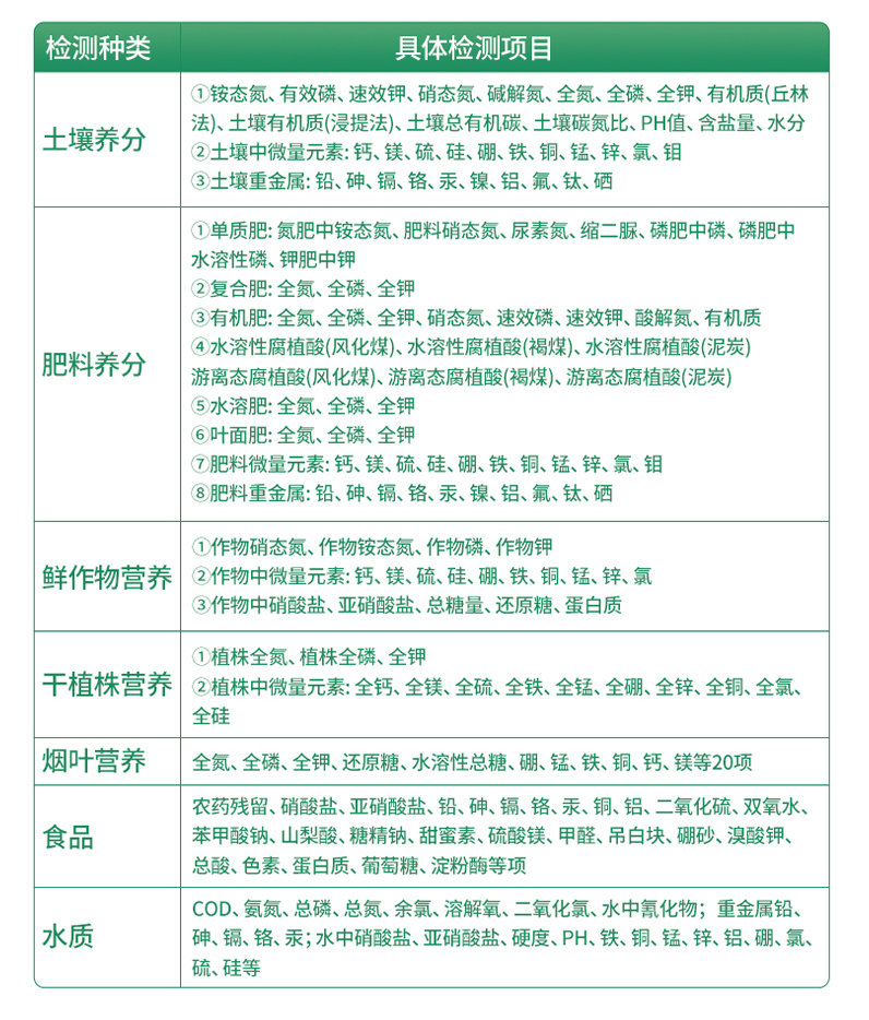 土壤養(yǎng)分:土壤銨態(tài)氮、土壤有效磷、土壤速效鉀、土壤硝態(tài)氮、土壤水解氮、土壤全氮、土壤全磷、土壤全鉀、土壤有機質(zhì)(丘林法)、土壤有機質(zhì)(浸提法)、PH值、含鹽量、水分。
