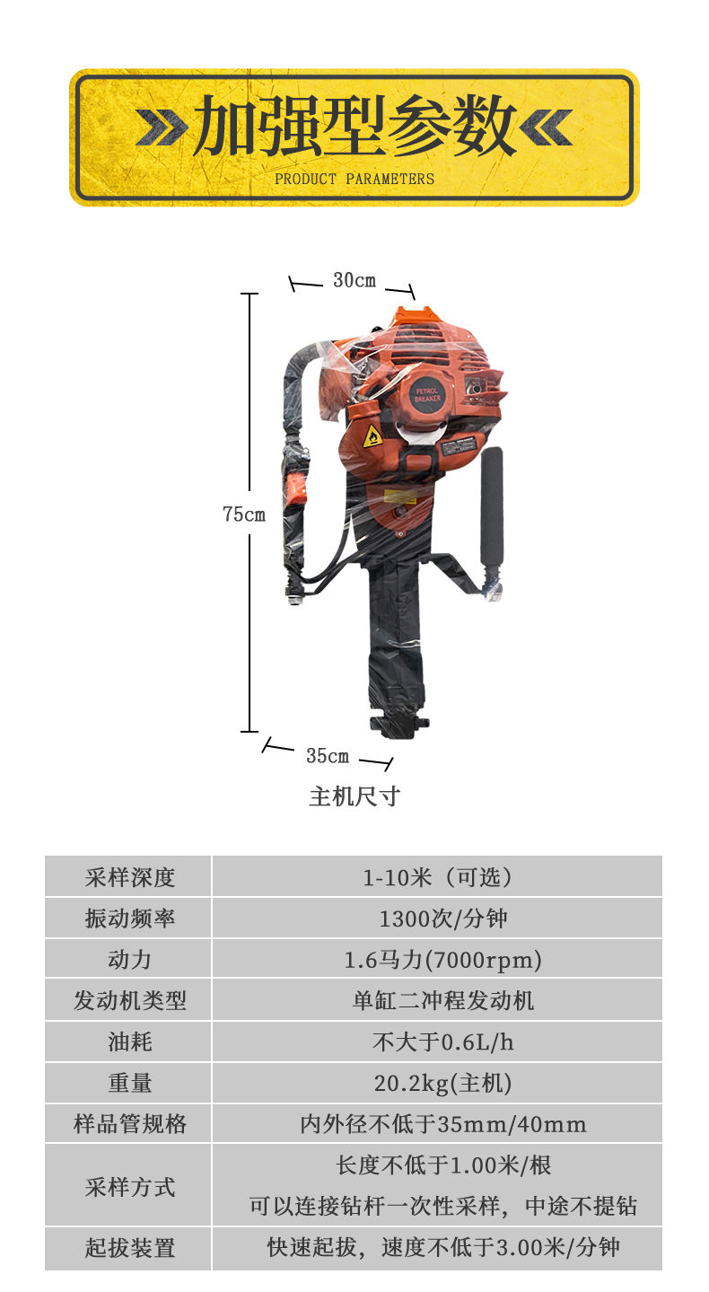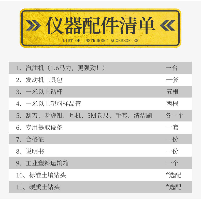 汽油動力發(fā)動機一臺,發(fā)動機工具包一套,標準土壤鉆頭、硬質(zhì)土鉆頭隨意選配,不小于1米的鉆桿5根、不小于1米的塑料樣品管2根,刮刀、老虎鉗、耳機、5M卷尺、手套、清潔刷各1個,專用提取設(shè)備1套、工業(yè)塑料運輸箱1個